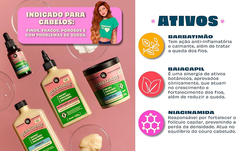 Baicapil – Combinação sinérgica de ativos botânicos. Niacinamida: Fortalece o folículo capilar. Barbatimão: Com propriedades anti-inflamatórias e calmantes.